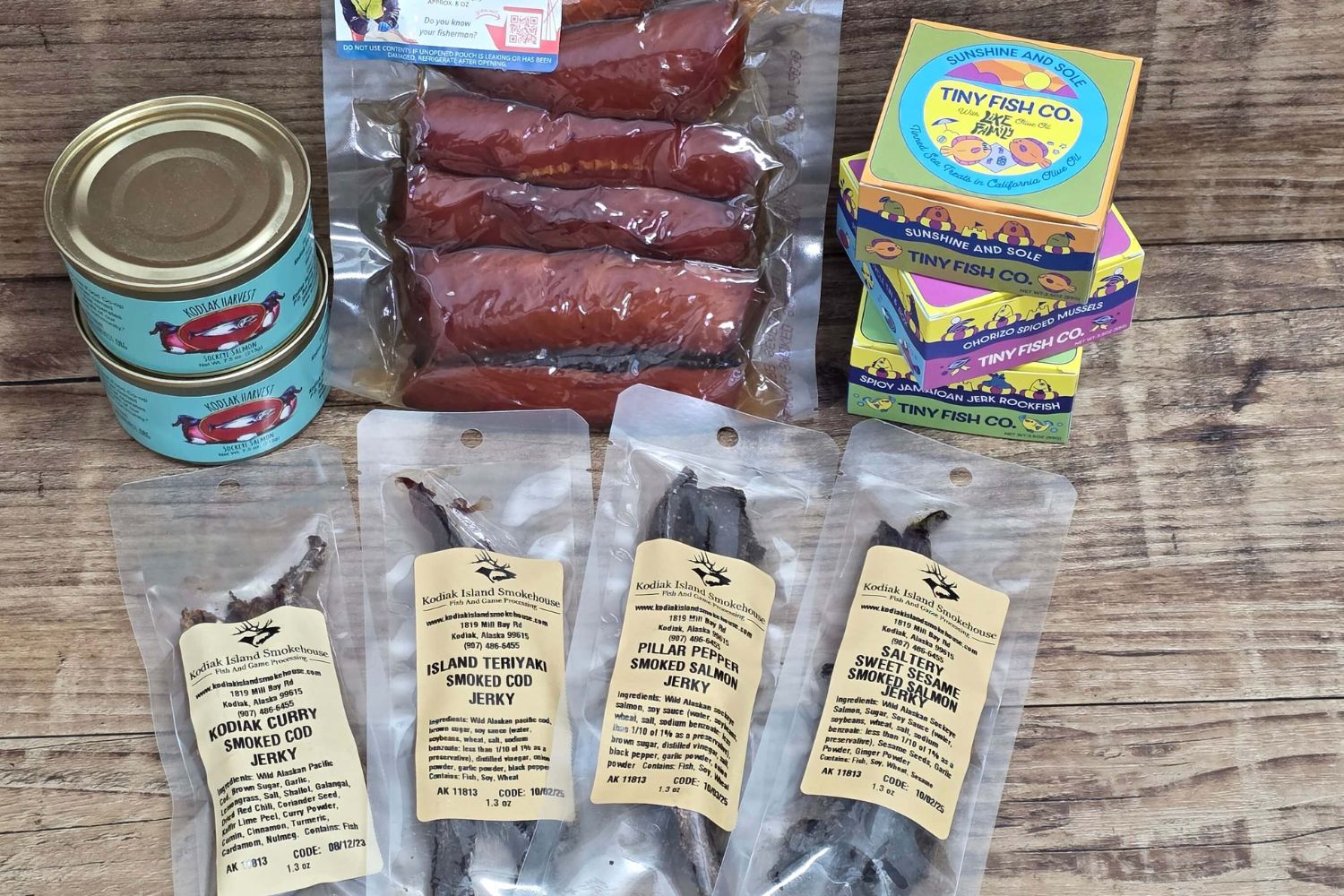 Includes four 1.3 oz jerkies, one 8 oz smoked coho strip pack, one 7.5 oz sockeye can, and your choice of an additional seafood can.